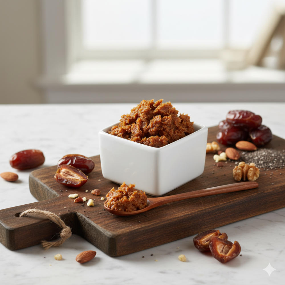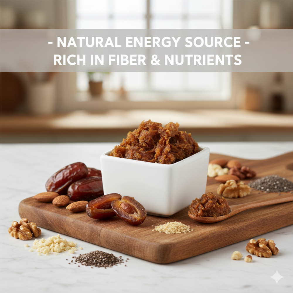 الاستخدام: حشوة للحلويات والمعجنات (المعمول، الكعك)، محلي طبيعي، أو أساس لمخفوقات الطاقة الصحية.